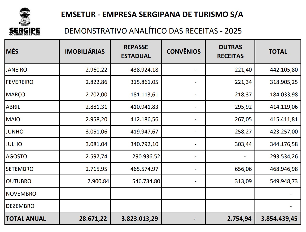 Demonstrativo das receitas da EMSETUR no ano de 2025 do mês de janeiro a outubro