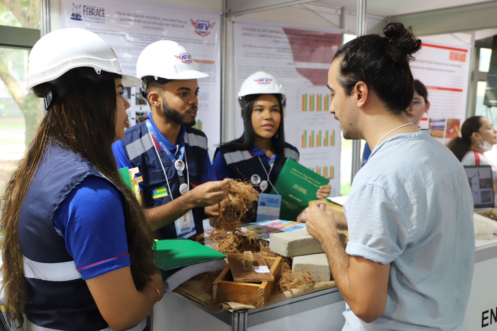 No eixo 'Engenharia', o Colégio Estadual Anfilófio Fernandes, de Umbaúba, participa da Febrace pela segunda vez. O projeto atual, intitulado 'Fibra de cocos nucifera: uma alternativa sustentável na produção em tijolo de solocimento', chamou a atenção da Comissão Julgadora por levar à Feira uma proposta sustentável de fabricação de tijolo à base de fibra de coco. A pesquisa foi realizada pelos estudantes Yan Kayk da Cruz Ferreira, Shaiana Lima Guimarães e Raquel de Souza Cruz, orientados pelo professor Makel Bruno Oliveira Santos e coorientado pelo ex-aluno do colégio, Alisson Souza da Cruz.